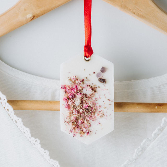 Ambientador sólido de cera de soja para nuestro armario, hecho a mano y adornado con elementos botánicos. Son ideales para perfumar cualquier cajón o armario. Un nuevo accesorio para tu hogar que gracias a su cinta lo podrás colgar dónde prefieras.